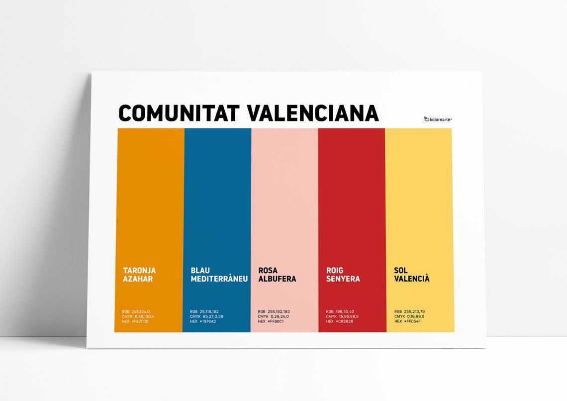 Luz alta, energía constante y contraste bien llevado. La Comunidad Valenciana combina azules mediterráneos, naranjas vivos y tonos claros sin complejos. Una paleta optimista y directa, de sol presente y ritmo alegre, donde tradición y disfrute conviven sin pedir permiso. Identidad luminosa, con carácter propio.